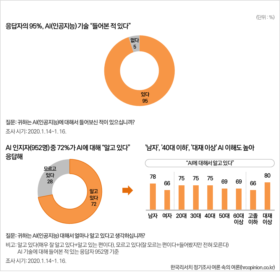 AI에 대한 대중의 인식도 긍정적으로 변화하고 있습니다. 최근 조사에 따르면, 95%의 응답자가 AI에 대해 들어본 적이 있으며, 72%는 AI를 이해하고 있다고 응답했습니다. 이는 AI 기술이 점점 더 많은 사람들에게 알려지고 있다는 것을 의미합니다.